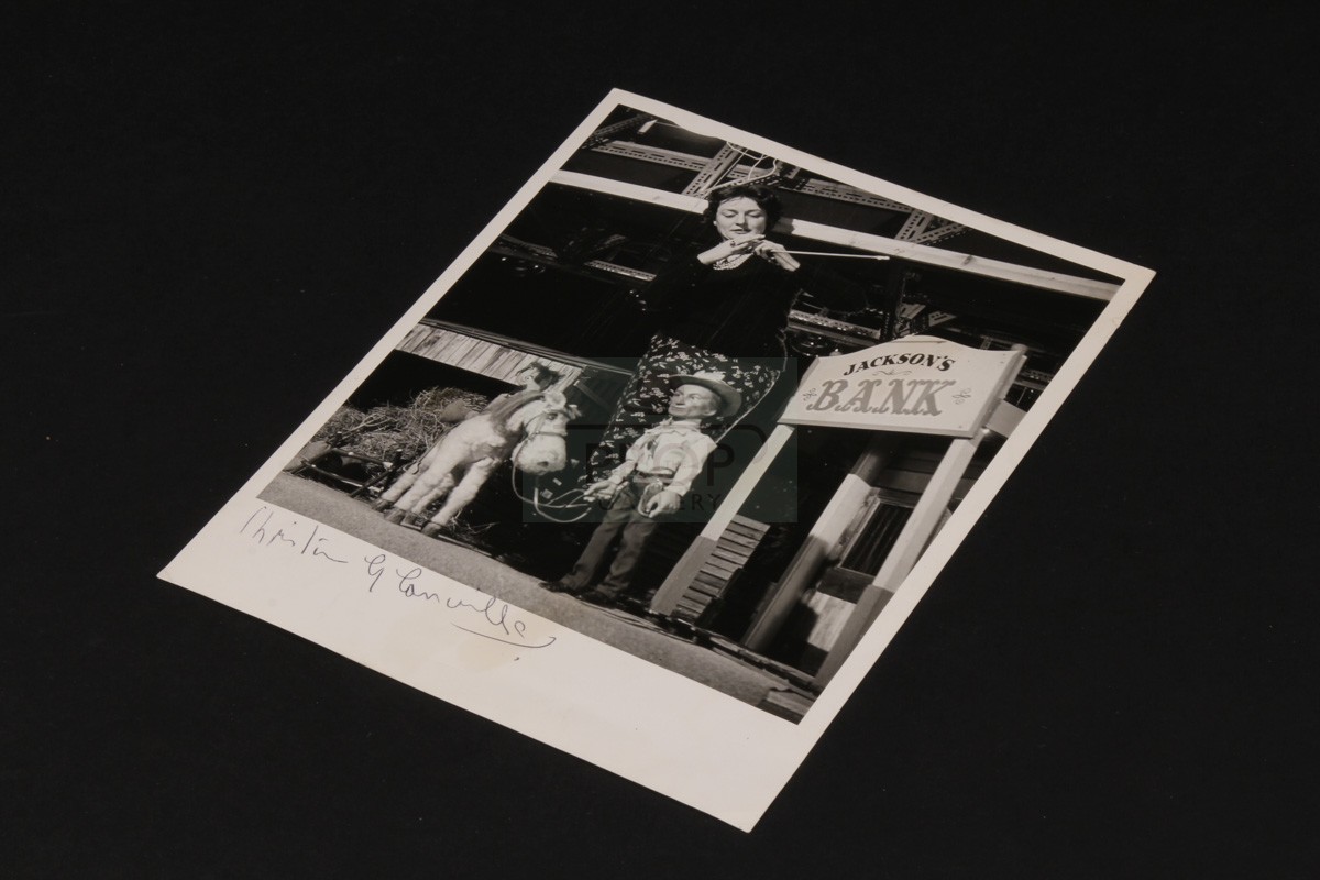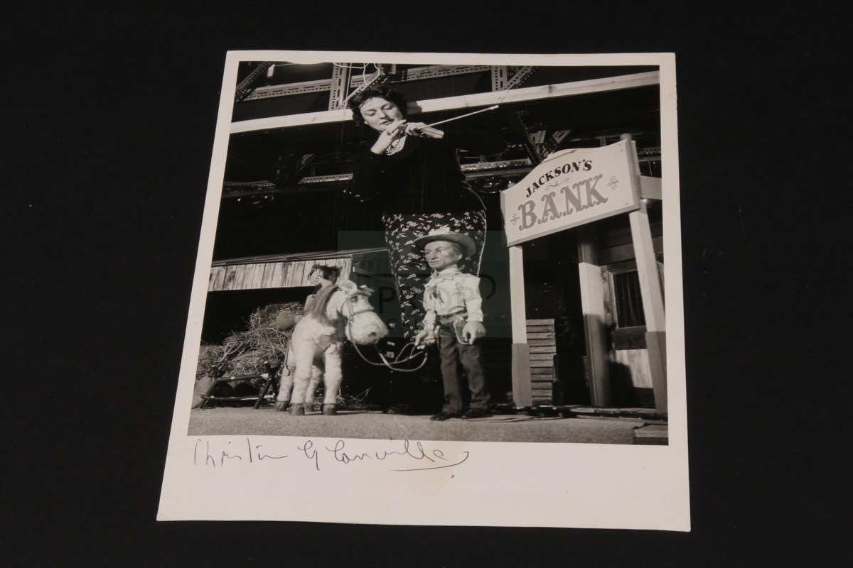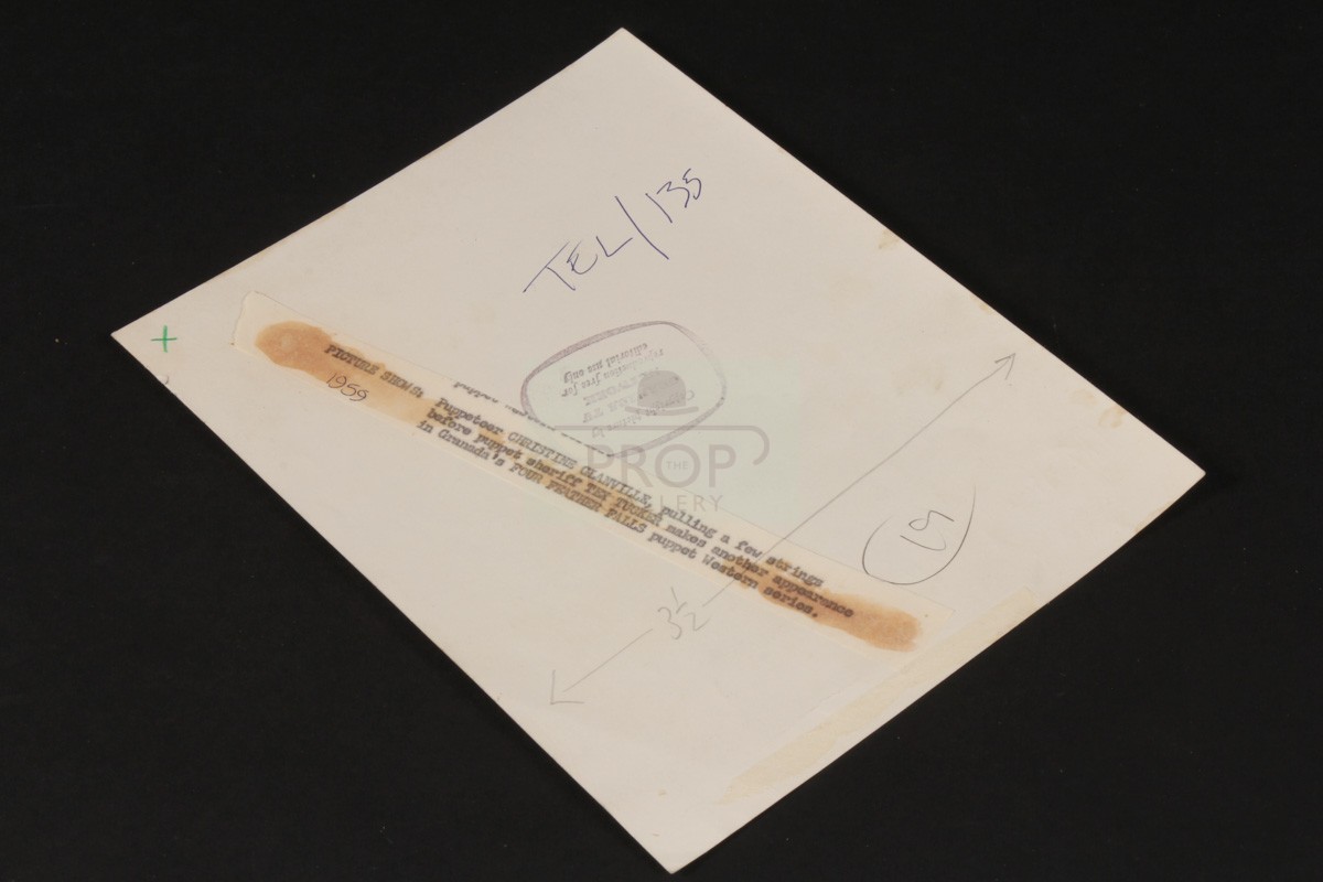 This vintage original black and white still was issued by Granada Television to promote the series, the still shows Sheriff Tex Tucker puppet being operated by noted puppeteer Christine Glanville who would go on to work on every Gerry Anderson puppet series and was responsible for creating some of his most famous characters. The still features a Granada Television ink stamp to the verso with a tipped paper snipe describing the photograph which has been hand inscribed with the date 1959, other inscriptions relate to its reproduction in publications. The still has been hand signed in black pen by Glanville who passed away in 1999.