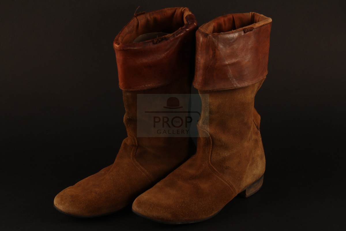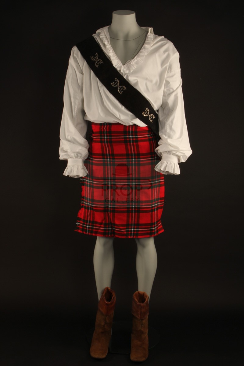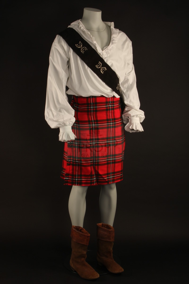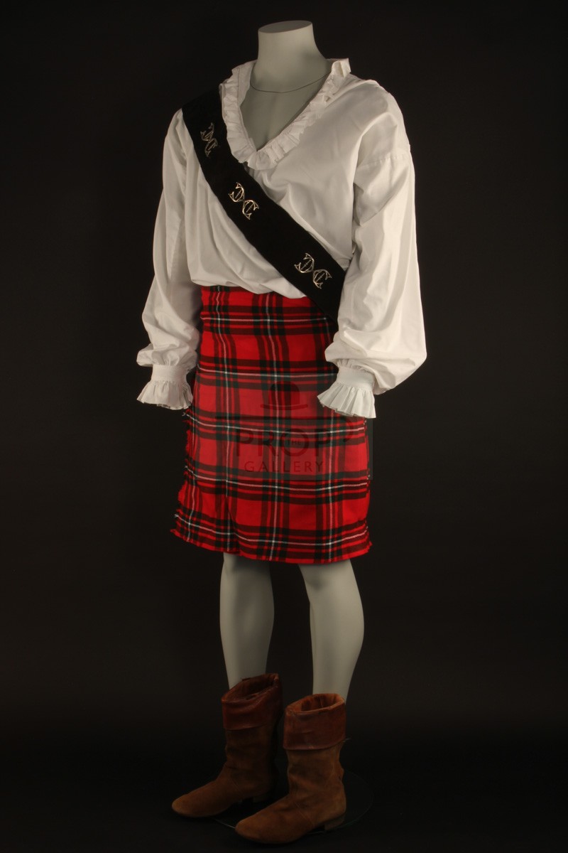 The costume comprises of a period dress shirt of white cotton featuring frill detail to the collar and cuffs with the original Bermans & Nathans label to the interior collar, a sword sash of leather with applied metal details and bespoke leather boots by noted makers Anello & Davide of Covent Garden, London. These costume pieces were sourced by the BBC from leading theatrical tailors Bermans & Nathans and would have been created years earlier and used in various productions as part of their hire stock, the original kilt worn on screen by Hines was returned to Bermans & Nathans following filming and has been lost without trace so the ensemble is completed for display purposes by a modern reproduction of similar pattern, the remainder was retained by Frazer Hines for over two decades before being obtained directly from him by The Prop Gallery.