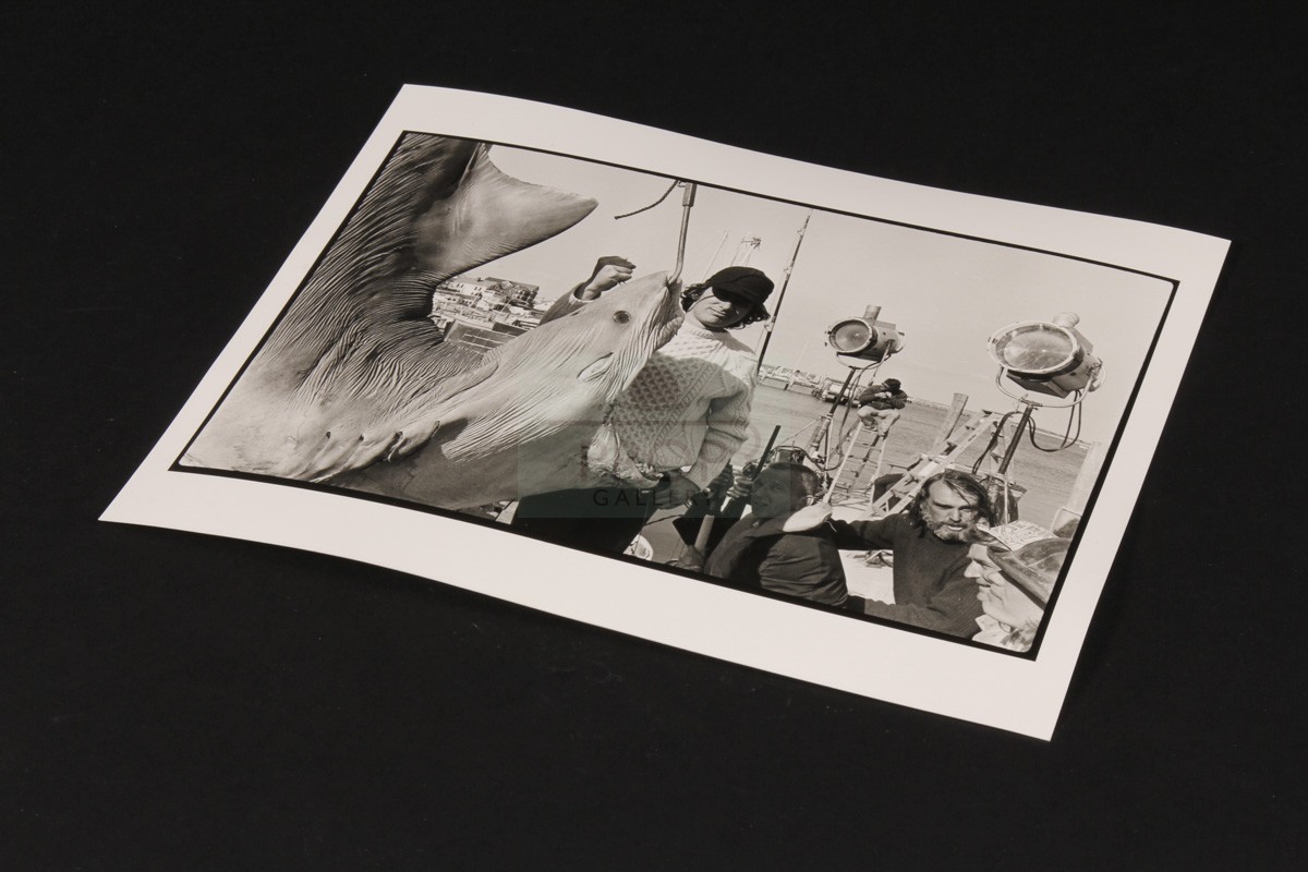 This vintage original black and white still is an original studio file photograph printed on semi-gloss double weight paper stock and shows a wonderful behind the scenes image of director Steven Spielberg during location filming at Martha's Vineyard. Spielberg is posing with the remains of a genuine tiger shark shipped from Florida specially for the film which was affectionately referred to as Oscar during the shoot and portrays the shark briefly and incorrectly thought to be the killer. To the verso the photograph has been stamped in ink by stills photographer Louis Goldman.